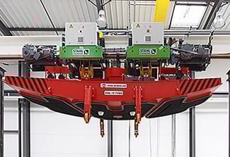 Für Tunnelbauten werden starke und zuverlässige Maschinen benötigt, die den Ausbau der Röhren sicher gewährleisten. ACIMEX produziert hierfür Segmentwägen und Segmentaufrichter, die auf der Tunnelbaustelle mit den einzelnen Schalungselementen operieren: Der Segmentwagen, ausgestattet mit einem Vakuumheber, greift und hebt die Schalungselemente vom Tunnelservicezug und befördert sie weiter ins Tunnelinnere. Hier werden sie von Segmentaufrichtern mithilfe eines Luftvakuums aufgenommen und an ihre endgültige Position gebracht. Ausgestattet mit zwei seitlichen Gummisaugern, die unter dem Fahrgestell befestigt sind, und einer zentralen Vakuumpumpe kann der ACIMEX-Segmentaufrichter Elemente in X-, Y- und Z-Richtung um bis zu 360° drehen. Bis zu 20 Tonnen schwere Teile werden so in die maximal höchst mögliche Position gehoben und mit einer Genauigkeit von ± 5° platziert. Die Hebetechnik, die diese Arbeit vollbringt, stammt oft von STAHL CraneSystems.