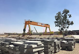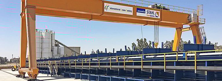 Oft kommen beim Ausbau der Straßen und Schienen Betonfertigteile zum Einsatz. Diese Teile werden in einem Fertigteilwerk produziert und nach dem Aushärten zu ihrem Bestimmungsort transportiert. Die Firma ECPC Company ist einer der führenden Hersteller von Betonfertigteilen in Ägypten und hat ihren Sitz in Madinat al-Aschir min Ramadan, einer Stadt 46 km nordöstlich von Kairo. Hier werden Betonteile für den Straßen- und Tunnelbau sowie Betonrohre für die Trink- und Abwasserversorgung hergestellt. Um die wachsenden Anforderungen des ägyptischen Marktes zu bedienen, beschloss ECPC das Werk durch einen neuen Betriebshof mit zwei Portalkranen zu erweitern. Bei der Vergabe des Auftrags konnte sich die Firma ICF International Crane Factory als zertifizierter Partner von STAHL CraneSystems gegen einen französischen Mitbewerber durchsetzen.