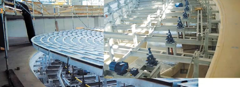 Pfaff-silberblau realisierte auf der Basis ihres umfangreichen Antriebstechnik-Know-hows sowie ihrer bewährten linearen Antriebselemente und Steuersysteme in mehreren Sport- und Mehrzweckhallen individuelle Hubvorrichtungen für die Laufbahnverstellung. Speziell bei Rundlaufbahnen „200 m“ müssen die Kurvenbereiche angehoben werden, um den hohen Laufgeschwindigkeiten der Athleten gerecht zu werden. Um den Sportlern optimale Voraussetzungen für ihre Aktivitäten zu bieten, lieferte Pfaff-silberblau eine Lösung, welche die Kurven im Scheitelpunkt um bis zu 1000 mm anhebt und gleichzeitig stufenlose Übergänge vom geraden Mittelstück der Laufbahn zu den Segmenten der beiden Kurventeile gewährleistet.