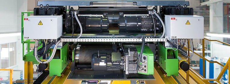 Diese Anforderung kann auf zwei Arten erfüllt werden: entweder durch die redundante Ausführung des Hubwerkes oder durch eine Not-Stopp-Bremse an der Seiltrommel in Verbindung mit einem redundanten Seiltrieb.