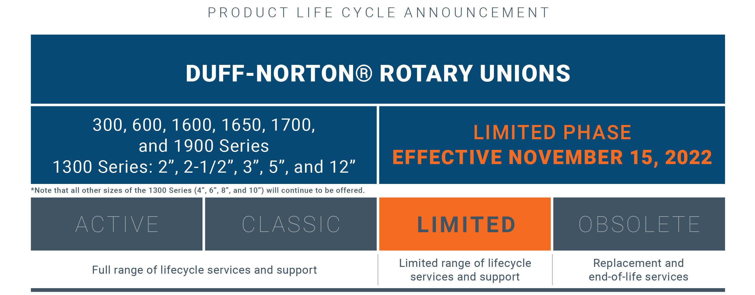 The rotary unions listed in this communication have been in the Active Phase since 2013. Per our lifecycle management process, they will move to the Limited Phase effective 11/15/2022. They will then transition to the Obsolete phase on 3/31/2023.