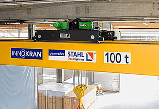 32, 63, and 100 tons are the maximum permissible safe working loads depending on where the load is being lifted in the building. The building is divided into a total of seven load sectors and crane control must meet Performance Level D standards to be able to operate safely. Therefore, several redundant systems have been incorporated. Auxiliary control developed by Innokran and linked to the STAHL CraneSystems control is based on a failsafe SPC. The load is evaluated both by the STAHL CraneSystems SMC 22 Multicontroller and the SPC.