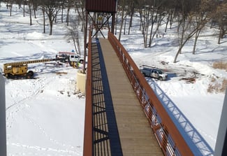Springtime thaws and flooding along the Red River have been annual problems for the cities of Moorhead, Minnesota and Fargo, North Dakota. Occasionally, flood waters have risen up to 40 feet above the river bank and damaged businesses, homes, and surrounding infrastructure. To prevent recurring damage to a pedestrian bridge between the two cities and decrease removal and replacement costs, a 168-foot bridge was commissioned with a self-contained lifting system, including new Magnetek radio remote controls and adjustable frequency drives.