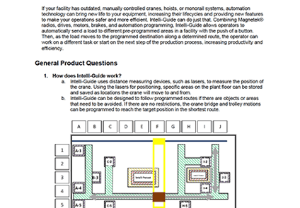 Columbus McKinnon has expanded its Intelli-Crane family of automation solutions with the new Intelli-Guide Auto-Dispatch System. Using Magnetek radios, drives and automation programming integrated with motors and brakes, Intelli-Guide allows operators to automatically send a load to different pre-programmed areas in a facility with the push of a button. As the load moves to the programmed destination along a determined route, operators can work on a different task or start on the next step of the production process, increasing productivity and efficiency.