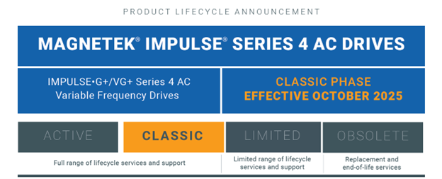 The Magnetek IMPULSE•G+/VG+ Series 4 Drives have been in the Active Phase since their release in 2011. Per our lifecycle management process, IMPULSE•G+/VG+ Series 4 models have moved to the Classic Phase effective October 2025.