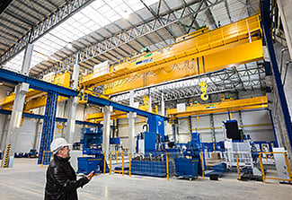 VVE took a major step toward self-sufficient production by commissioning its own production line for hydroelectric power plants. Four cranes work in a new industrial building, with safe working loads of 180 and 90 tons in one bay and 175 and 85 tons in the other. The solution is based on load measurement, laser-based position monitoring of the crane bridges and trolleys, distance between the cranes, and continuous communication among the cranes.